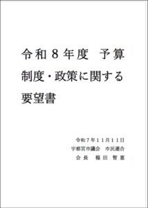 これらの現状を踏まえ、私たち宇都宮市議会市民連合は「令和8年度予算 制度・施策に関する要望書」として、重点13項目、全7分野68項目にわたる提言をとりまとめました。これらの内容が本市施策に反映されることを強く要望し、ここに提出いたします。
