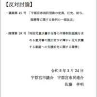 ■令和8年度 反対討論 会派を代表し、議案第45号 「宇都宮市消防団員の定員、任免、給与、服務等に関する条例の一部改正」の原案に反対する討論と、陳情第59号「特別児童扶養手当等の所得制限撤廃を求める意見書の提出並びに障 …