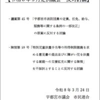 ■令和8年3月定例議会 反対討論 会派を代表し、議案第45号 「宇都宮市消防団員の定員、任免、給与、服務等に関する条例の一部改正」の原案に反対する討論と、陳情第59号「特別児童扶養手当等の所得制限撤廃を求める意見書の提 …